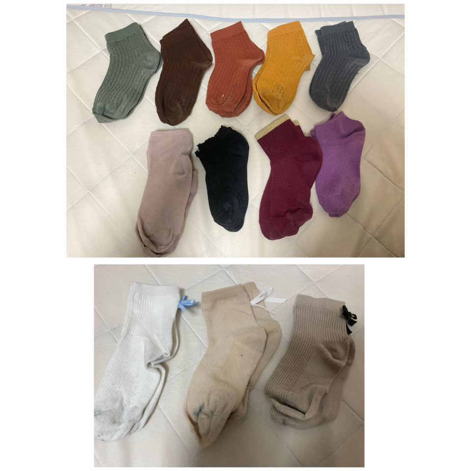 上が無地の靴下、下が足首にリボンが付いた無地の靴下となります🧦 どれも愛用しているので、毛玉だらけです😖💧❤︎
