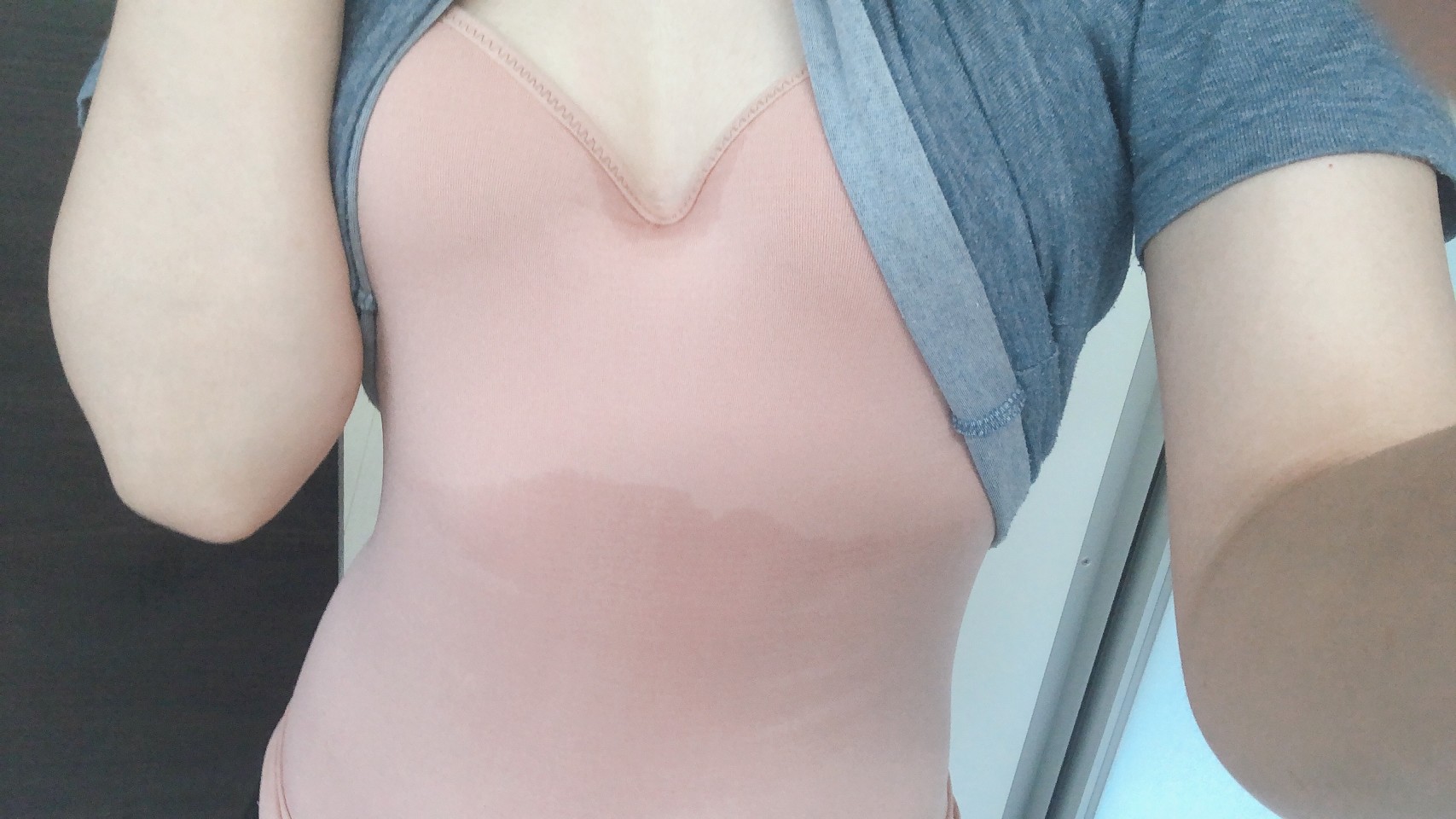 30分くらい軽く有酸素運動しただけで滝汗(T . T) 真夏の運動はどうなるんだろ( ;∀;) 谷間の際がじっとりと、肋骨から下がきれいに汗で濡れてるけどなんでこんな変な風にくっきりなってるんだろ笑