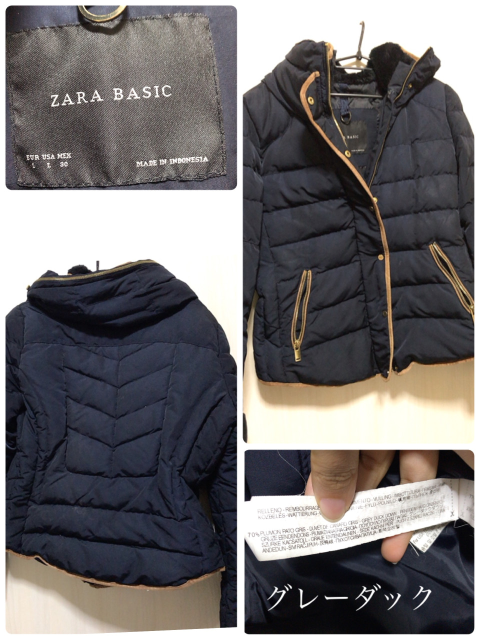 ② ZARA BASIC ○グレーダック ダウン主体 ○L サイズ ○フードジップ収納 ●お譲り時、おまけでお写真