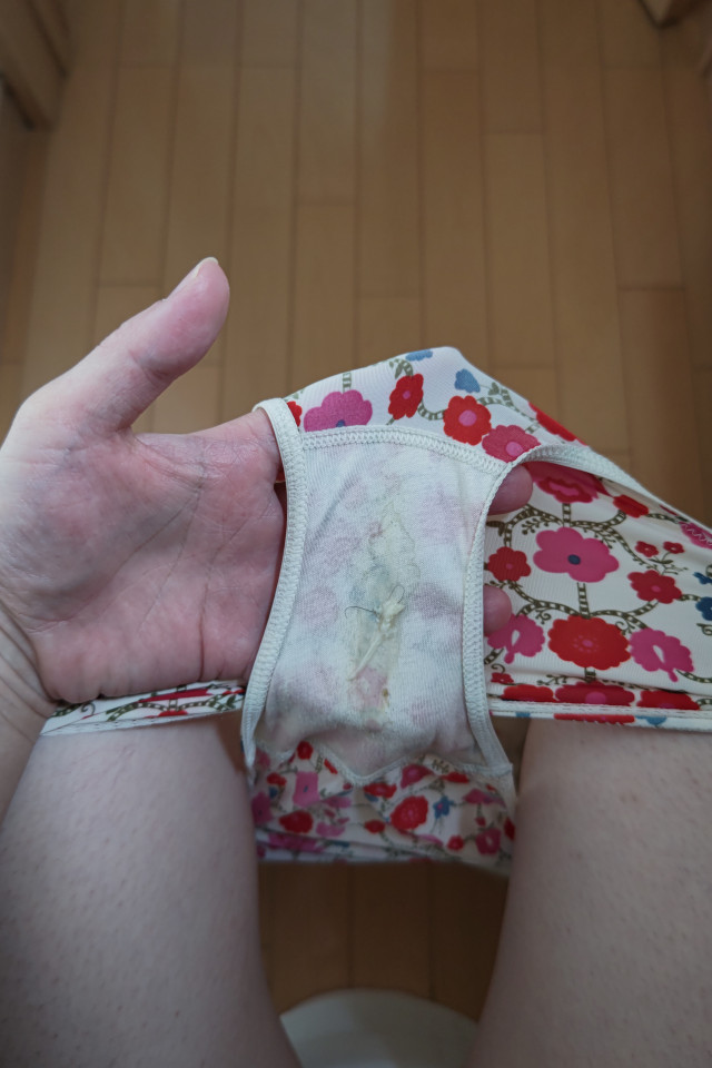 昨日の夜に履いて寝る前におなしたパンティー🙈エッチなシミだけじゃなくて、おりものとおけけもついちゃった…/// まだ今日1日履きます💜ご興味ある方いらっしゃったら夜に出品してみます💜