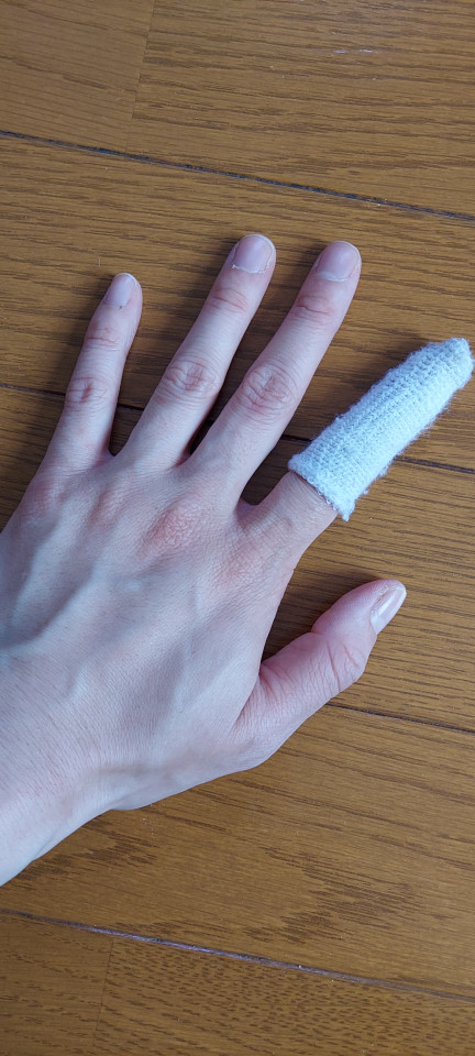 火曜日に切ってしまった指、最初は病院で言われた通りガーゼに包帯にでグルグル巻きの太い指だったけど、今では絆創膏にネット包帯。