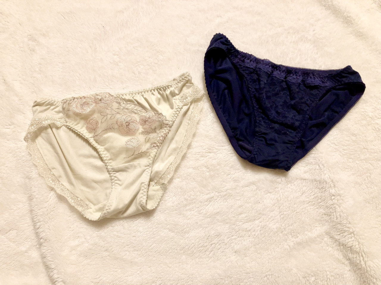 左は黄色味のあるクリームっぽい色で、毛玉がちょこちょこできてます💦表は刺繍とレースです♡ 右は濃いめの紺色で、表のレース部分に少し毛玉が…💦