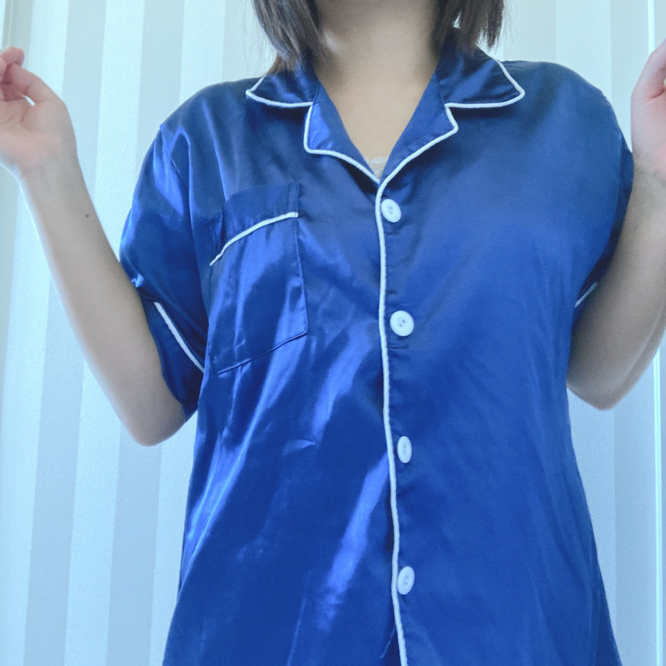 今日は、最近毎日愛用しているブルーのサテンルームウェアを出品しました!