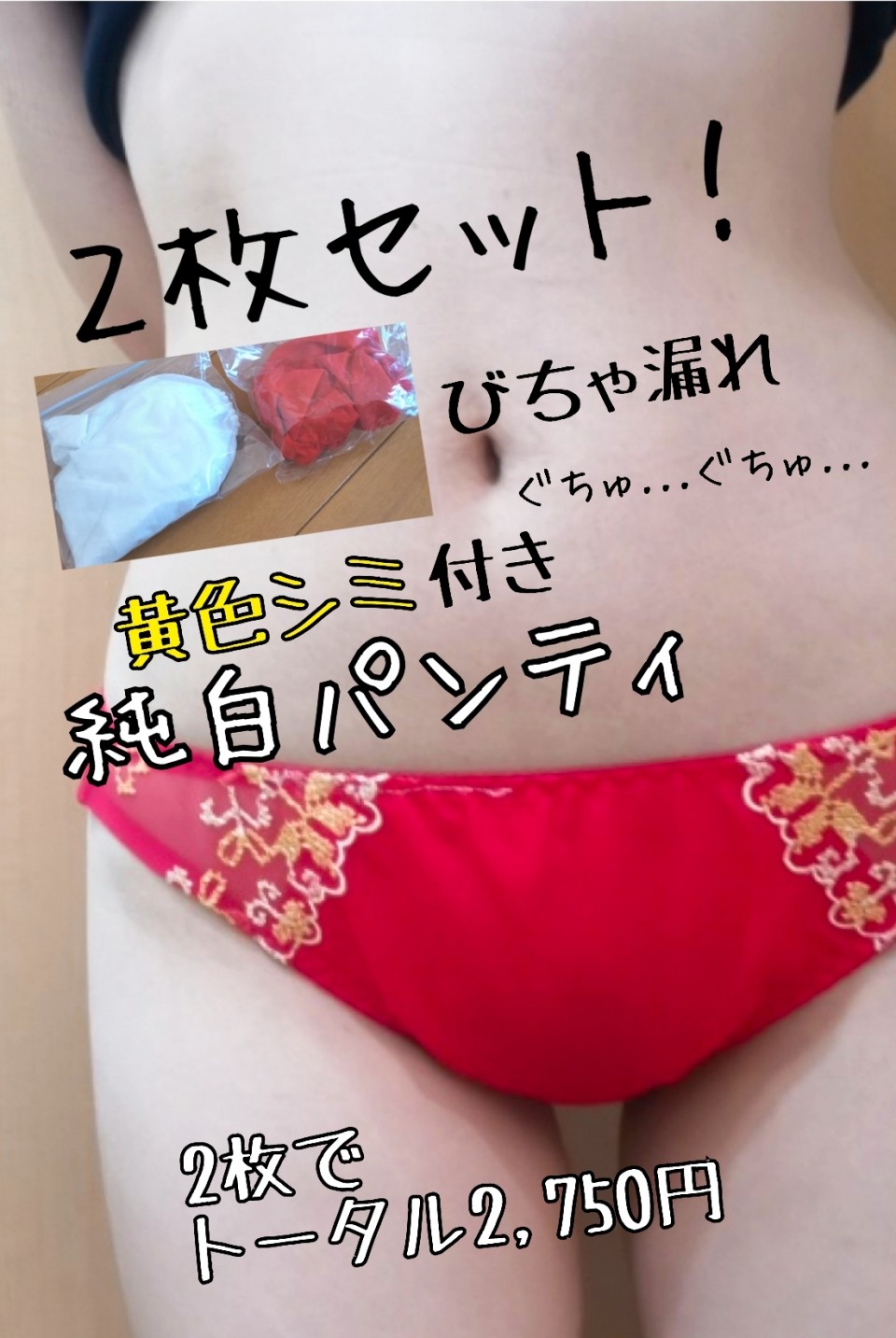 2枚のお得セットを出品しました! 紅白パンティセットですo(*⌒―⌒*)oちょっと黄色いシミがついてて恥ずかしいです汗。