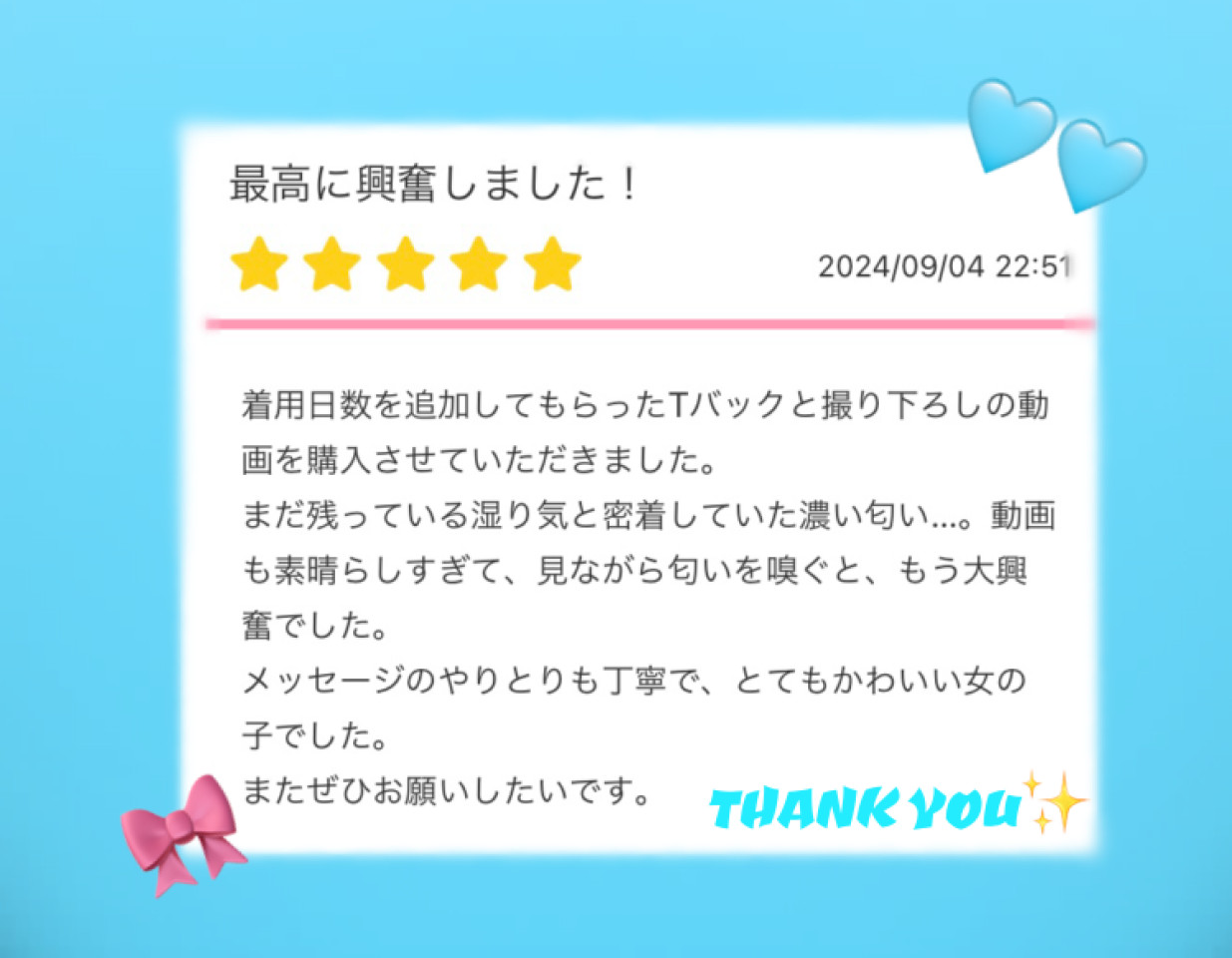 みくのアソコでたっぷり汚れたTバックパンティと、オナニー動画で興奮していただけて…すごく嬉しいです🥹🩵ありがとうございます😭🩵