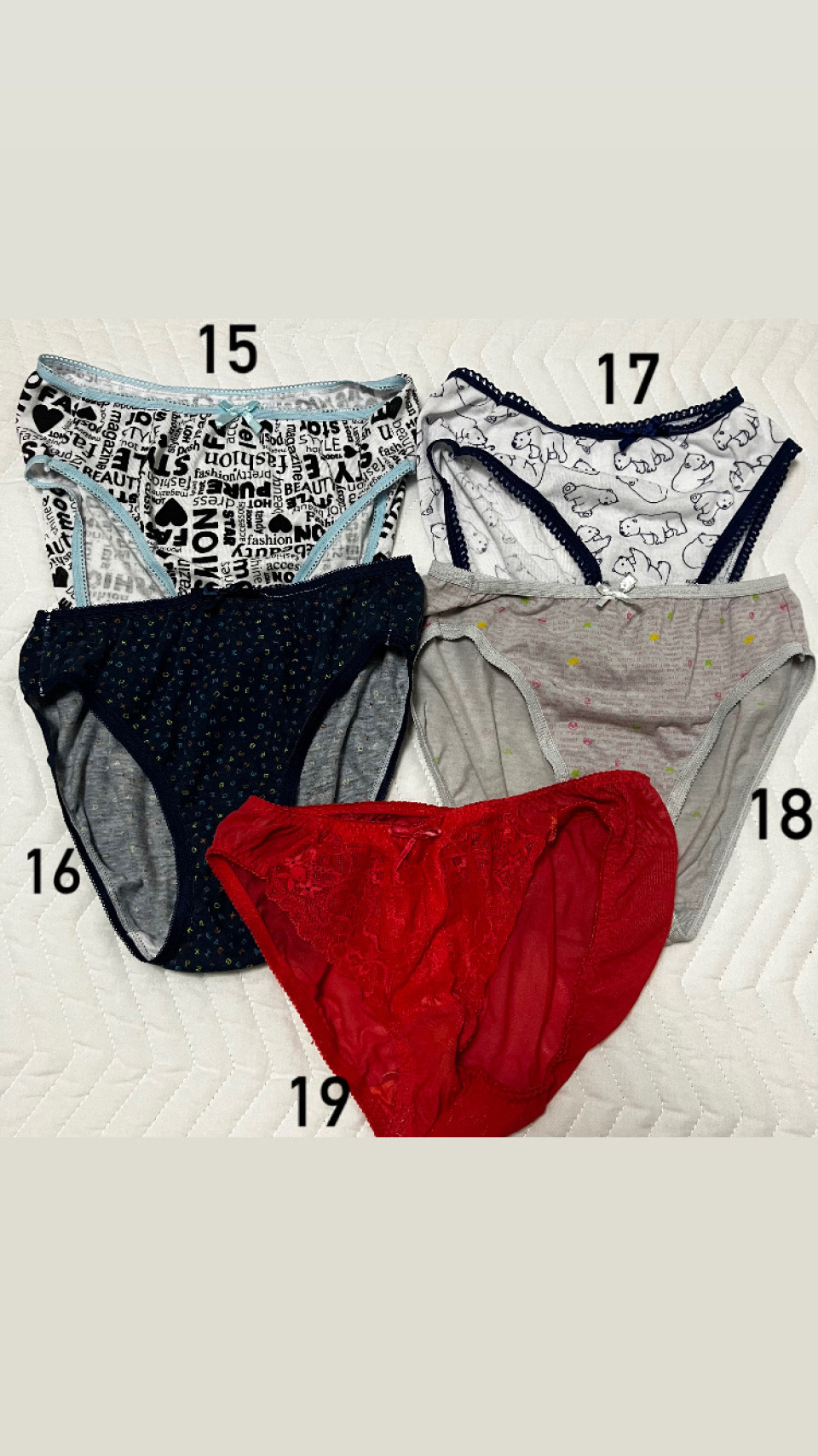 パンツのみ 15 英字柄 綿素材 16 カラフル英字柄 綿素材 17 熊柄 綿素材 18 英字+ひよこ柄 綿素材 19 赤 レース柄 ポリエステル