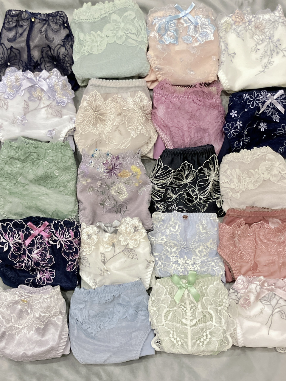 メッセージにて「後ろがレースではないパンティーで出品可能なものはあるか」とのお問い合わせをいただきましたので、現在出品可能なパンティーを並べて撮影してみました。