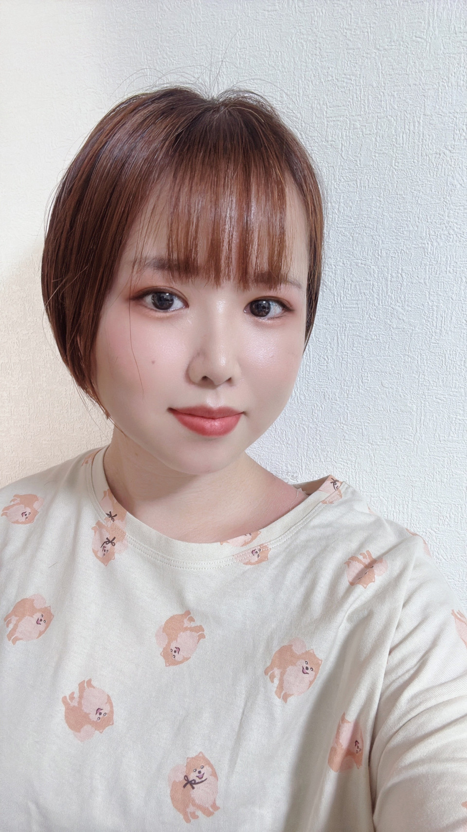 髪切りました〜! ショートからさらにショートへ変化! 似合ってますか? 部屋着もポメラニアンの可愛いやつ着てます。