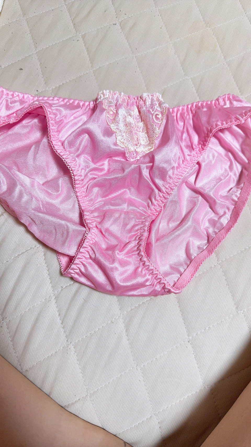 ピンク色のパンティーで1日お出かけしてきたよ♪ おしっこパンツで拭いたし、おりもの多いから匂い強め!? 是非購入よろしくお願いします🙇