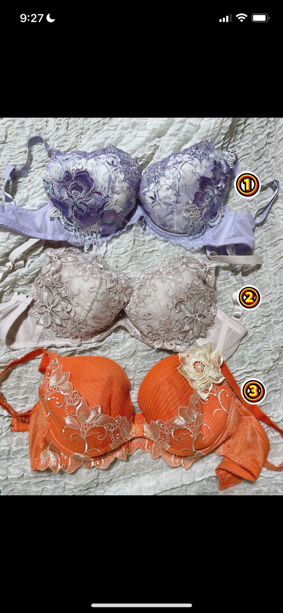 お譲りできるブラパン ブラのみの写真です❁︎ ①ヒミコ紫フルバックレース ②ヒミコ薄ピンクフルバックレース ③パルファージュオレンジTバック