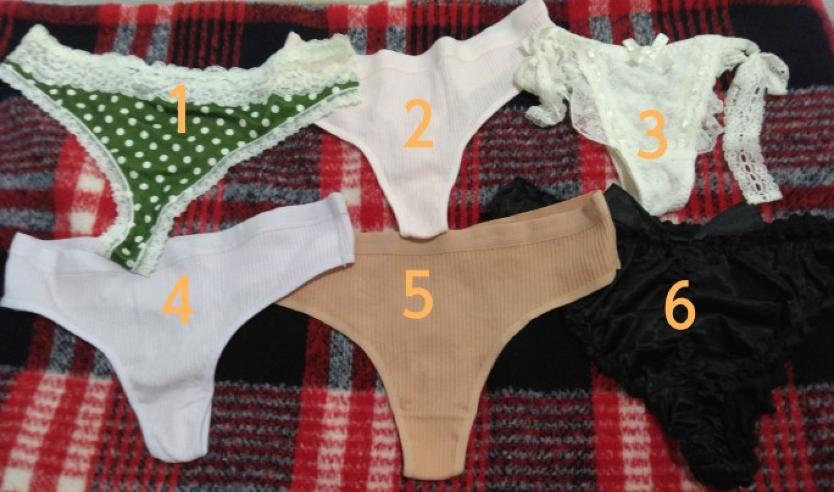 ①緑水玉サテン ②薄いピンク綿 ③ホワイトサイド紐レース ④薄いパープル綿 ⑤オレンジベージュ綿 ⑥黒サテンリボン