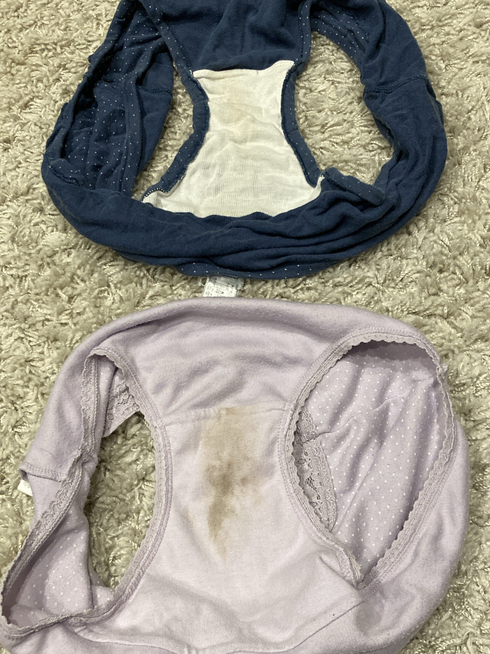 何年も履いているものだと、こちらの綿パンティ2つになります( ⸝⸝⸝ᵕᴗᵕ⸝⸝⸝ )🎀 落ちないシミがどちらもついてます😣💓