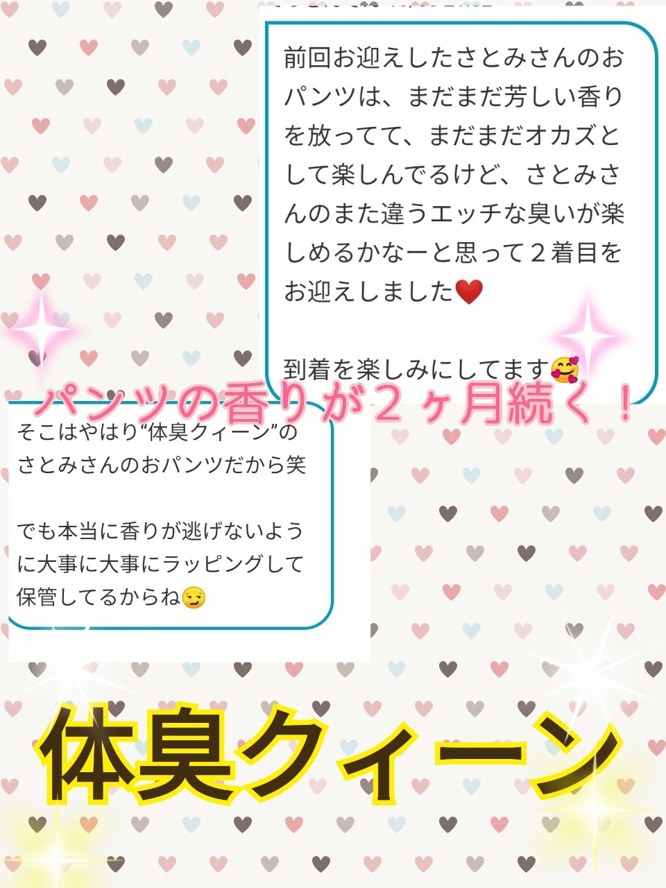 お客様とのやり取りで、体臭クィーンの称号をいただきました!!(笑)なんと!前回お迎えいただいたパンティがまだ臭いを放っているそうです。調べたら前回は2ヶ月以上前。2ヶ月以上持つって..(*゚Д゚*)!!コスパ良すぎません!?