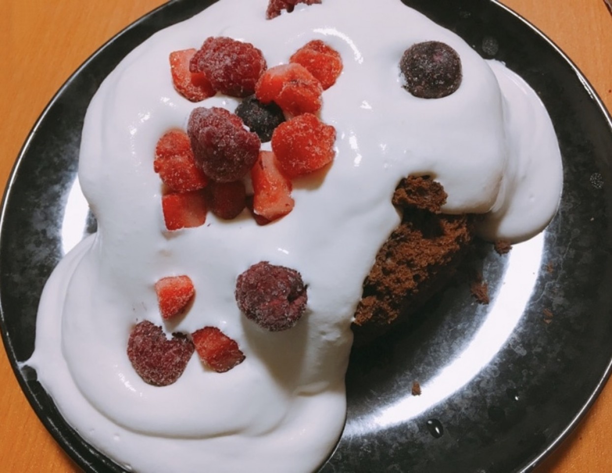 今日の朝ごはんはチョコケーキとベリーをのせたホイップ♪