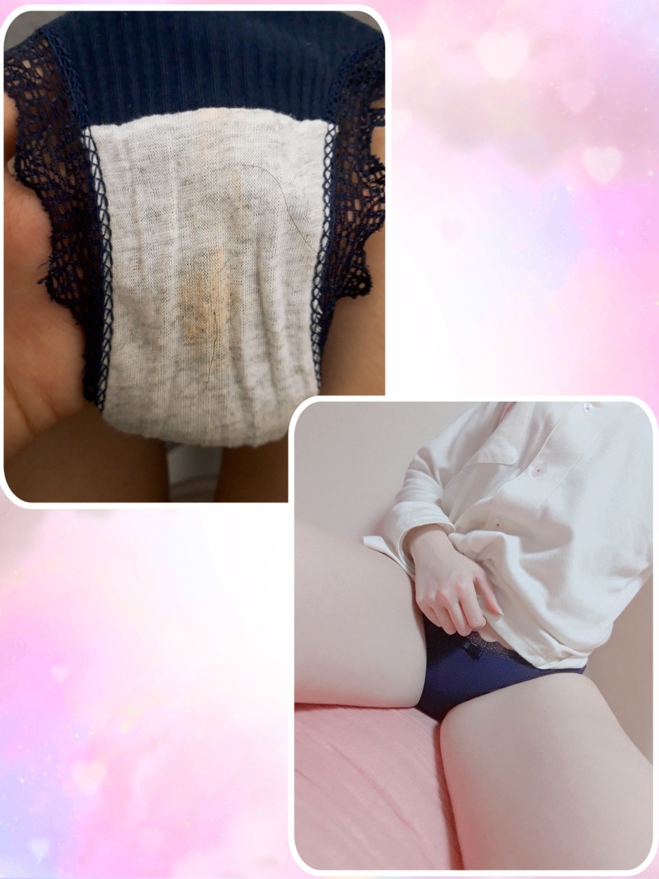 こんばんは、オリモノベッタリなパンティ出品しました! 生理後だからかなぁいつもよりオリモノがベッタリに…(∩ω∩) お迎え待ってます♥