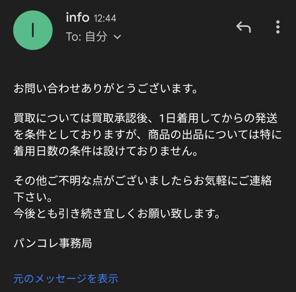 (メールに出てくる「買い取り」は事務局買い取りのこと。お兄様たちとのお取引の場合、着用の条件が無いんだって。)