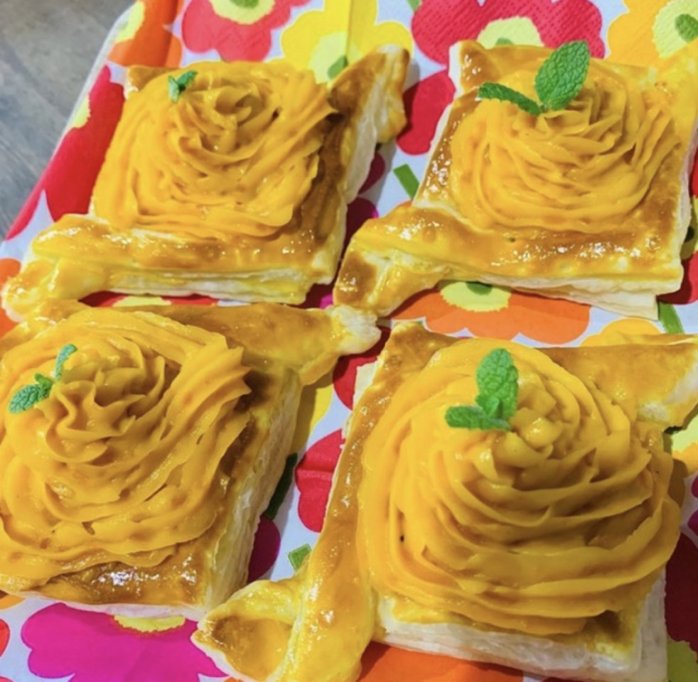 パンプキンパイ🎃 作りました✌️ パン屋さんで働いてたこともあるので、成形とかデコレーションは得意です👩🏻🍳🥖 カボチャを練って生クリーム混ぜて作ったよ〜💗 美味しくてすぐ無くなっちゃいました😭