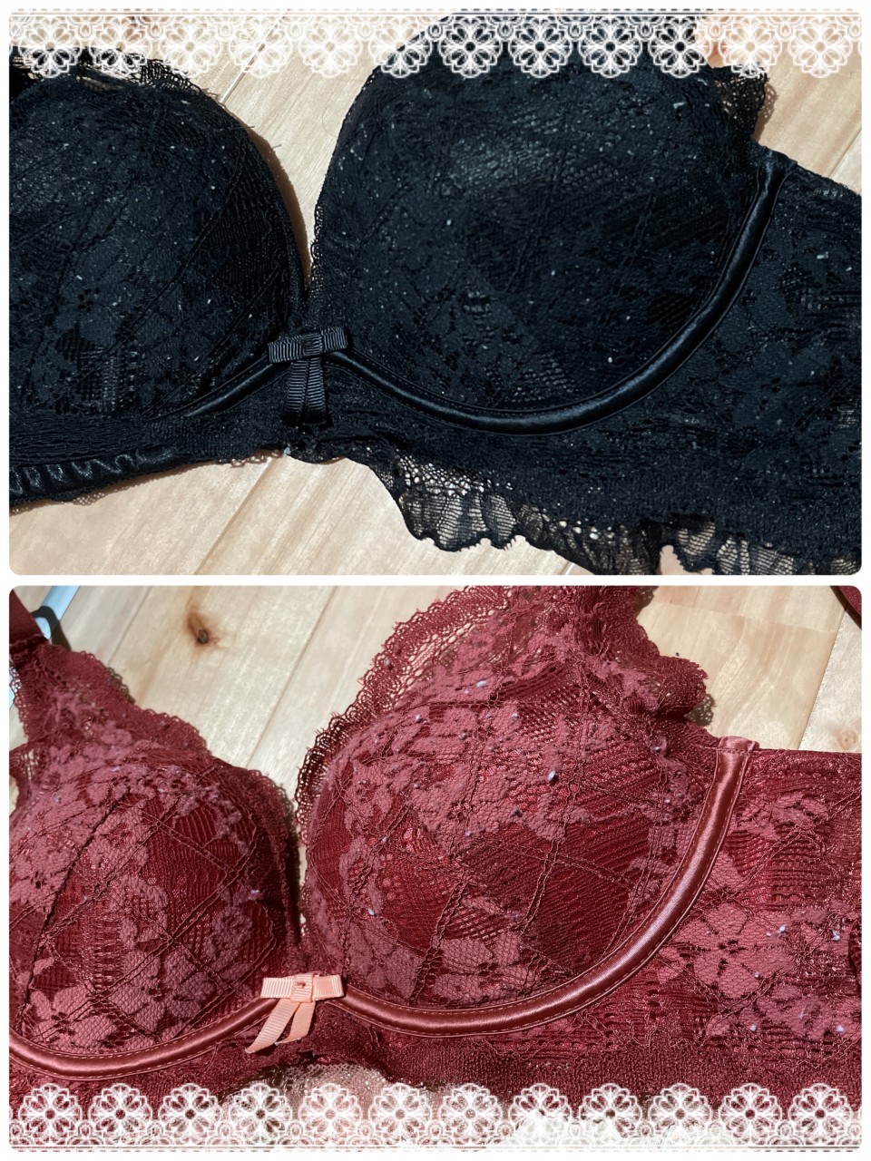 私のお気に入りブラの紹介です🥰 3年愛用中 ♡ 見た通り、毛玉たくさんついてます! レースもついていて可愛いですよね 💕 このブラとセットのパンティは 透け透けなんですよ...///