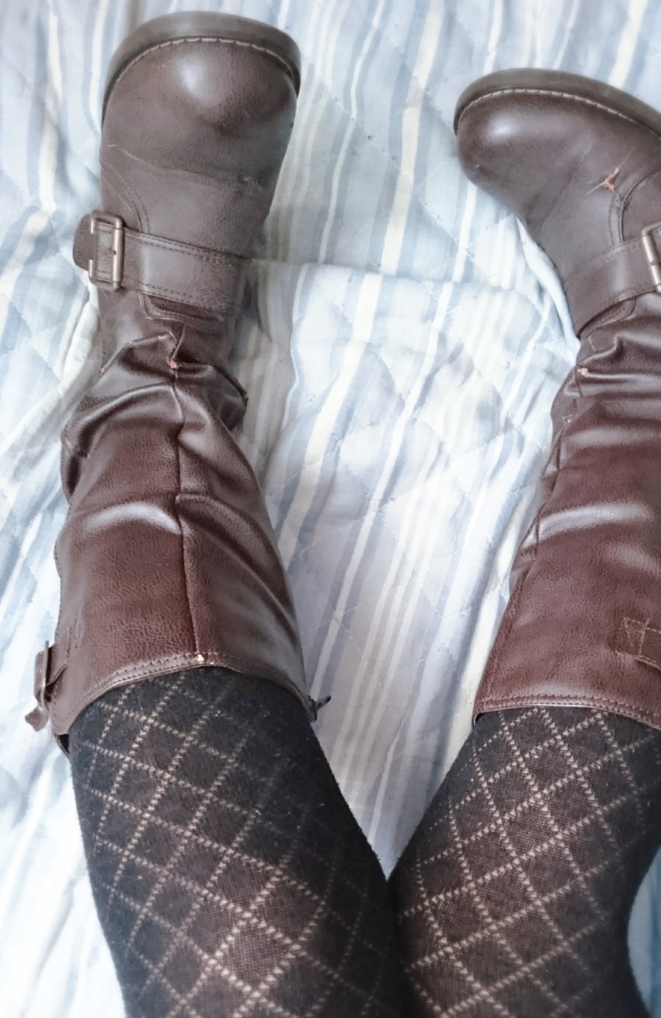 黒の綿パンツと伝線したストッキングセットも