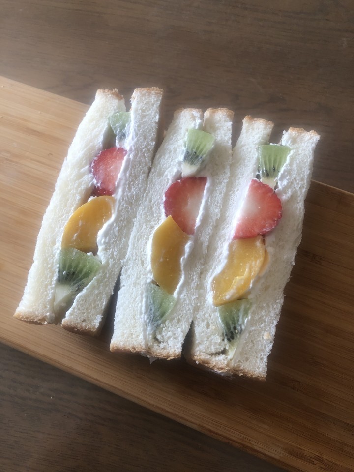 初めて、フルーツサンドを作ってみました。 なんか無性に甘いものが食べたくなって。 思ったより簡単に出来ました💕😊 また作りたいと思います