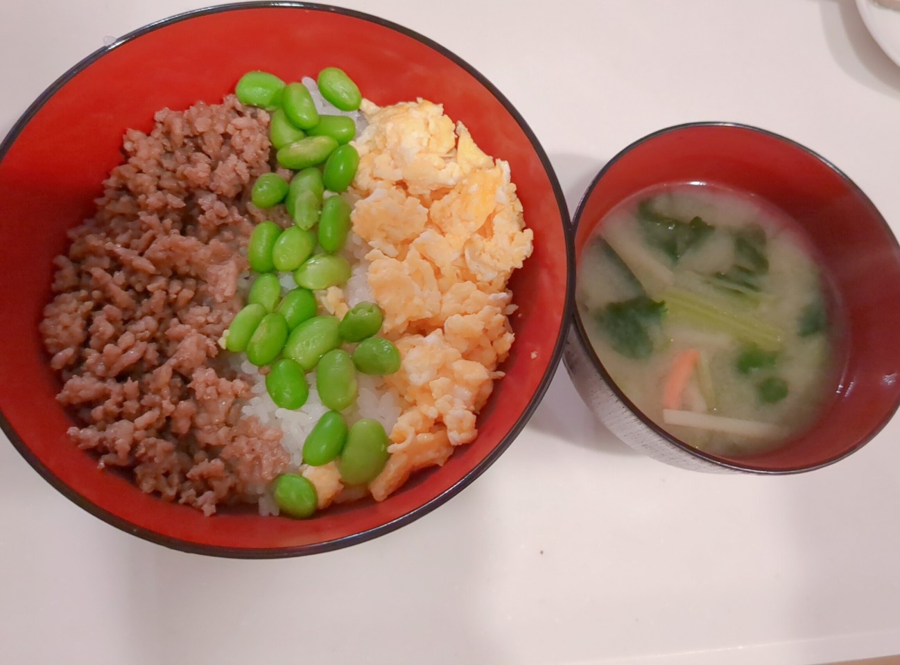 今日は三色丼❤と具沢山味噌汁☺️ 我が家の三色丼は枝豆です😁